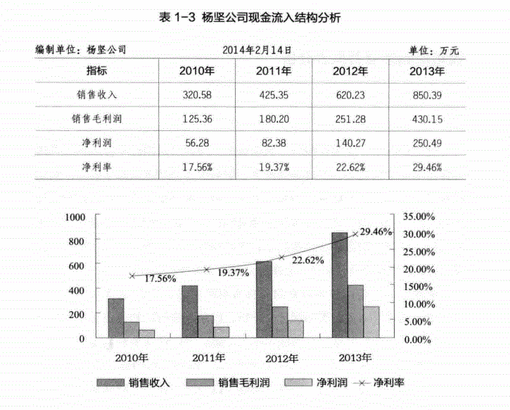 通过上面的图表可以看出,杨坚公司销售收入、销售毛利润、净利润及净利率都在呈上升势头。显然,看到这样的报表,股东肯定会很高兴,因为这意味着自己的股本也在不断增值。当然,在分析财务报表的时候,酹要将几张报表,乃至附注予以统筹考虑,才能得出比较客观而正确的认识。